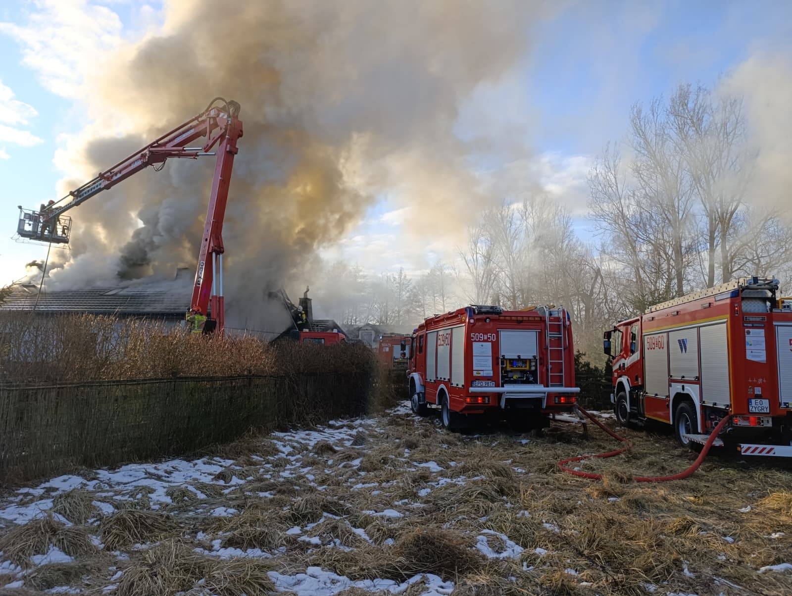 Po dotarciu na miejsce zdarzenia strażacy zastali palący się dach budynku, którego znaczna część była już objęta ogniem. W chwili wybuchu pożaru właściciel domu przebywał poza obiektem.